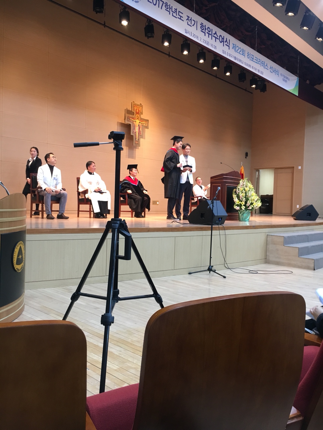 대구가톨릭대학교 의과대학 6년의 생활을 마무리 하고, 의사로서 첫 발을 내딛는 졸업생들을 위해, 최정윤 학장님의 축사, 이성우 동창회장님을 대신해, 학장단의 배지훈 대외협력부학장님께서 동창회장상 (화합상) 시상을 해주셨습니다.